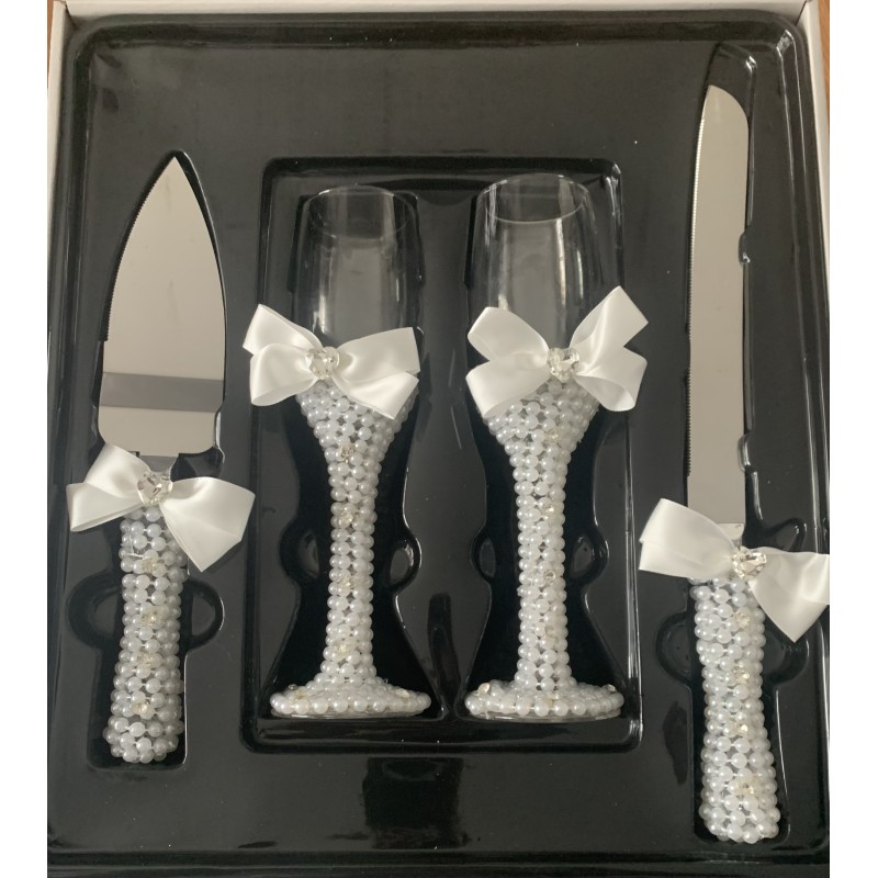 Kit Mariage Pelle et Couteau en Verre avec Perlage Blanc Élégance & Raffinement pour la Découpe du Gâteau