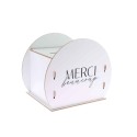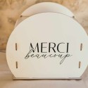 Urne ronde “Merci Beaucoup” en bois blanc et noir. Élégante et moderne, parfaite pour recueillir enveloppes, messages et attentions lors de vos événements.
